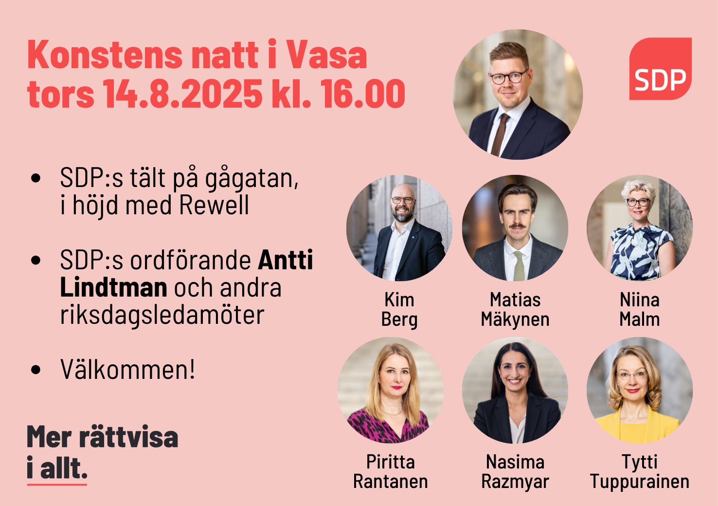 SDP finns på plats på gågatan under Konstens natt i Vasa den 14.8 kl. 16-20.