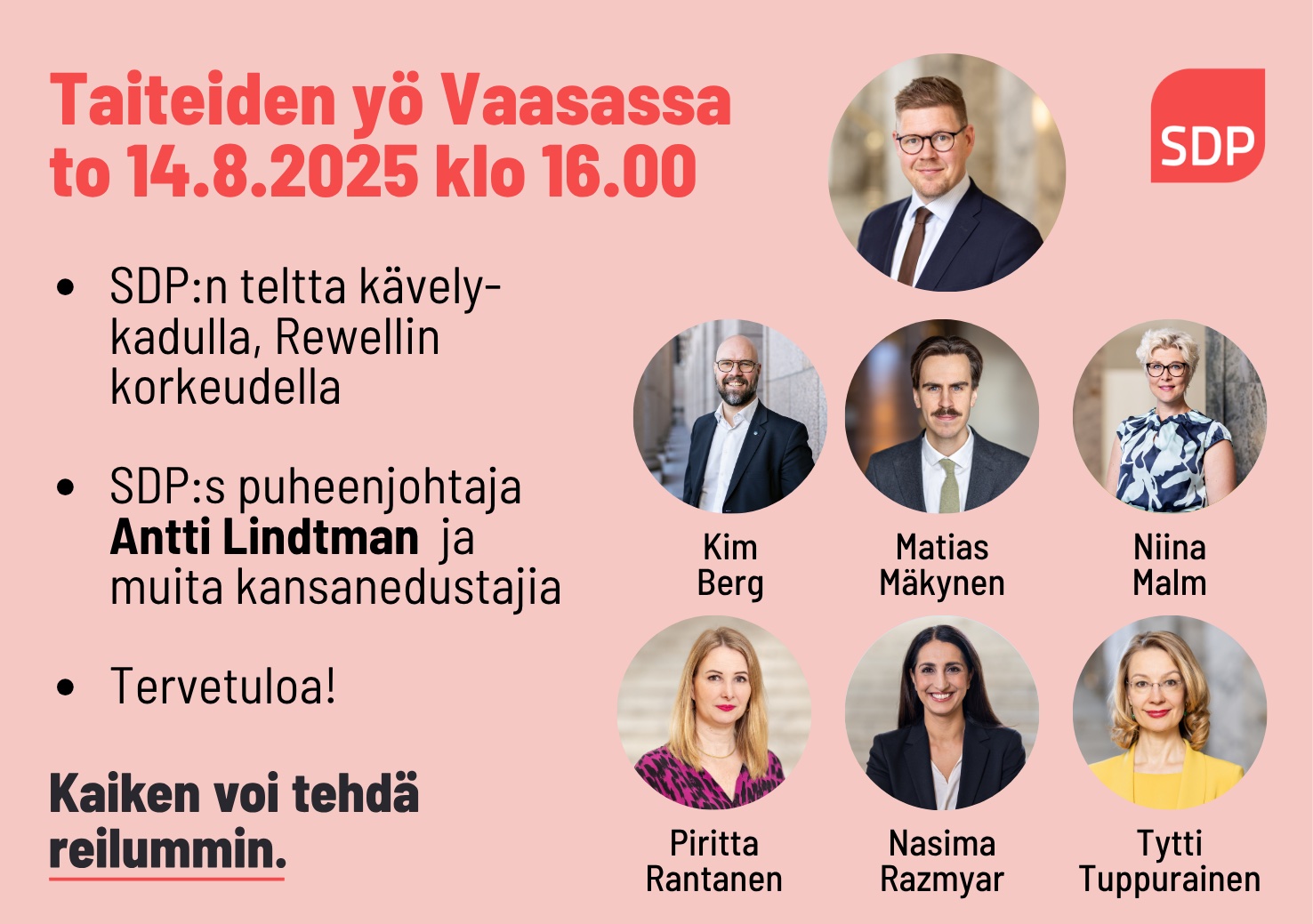 SDP on paikalla kävelykadulla Vaasan Taiteiden yössä 14.8. klo 16-20.
