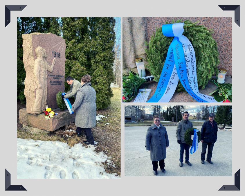 Oili Airaksinen-Rajala, Seppo Hakala ja Erik Cederholm laskivat seppeleen 1918 vakaumuksensa puolesta kaatuneiden muisto-merkille.